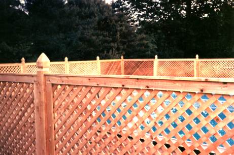 1½ by 1½ square pickets for hot tub enclosure Cedar shadow with lattice topper All cedar lattice pool enclosure with Tisbury posts Hard and challenging jobs are our specialty - a cedar fence built into the top of a stone wall