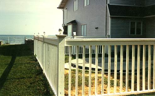 Old fashion cedar fence with "federal caps", stained white Cedar step style Nantucket top privacy fence 4 foot high stepped Edgartown lattice fence with scalloped tops Black 4 ½ foot high aluminum fence